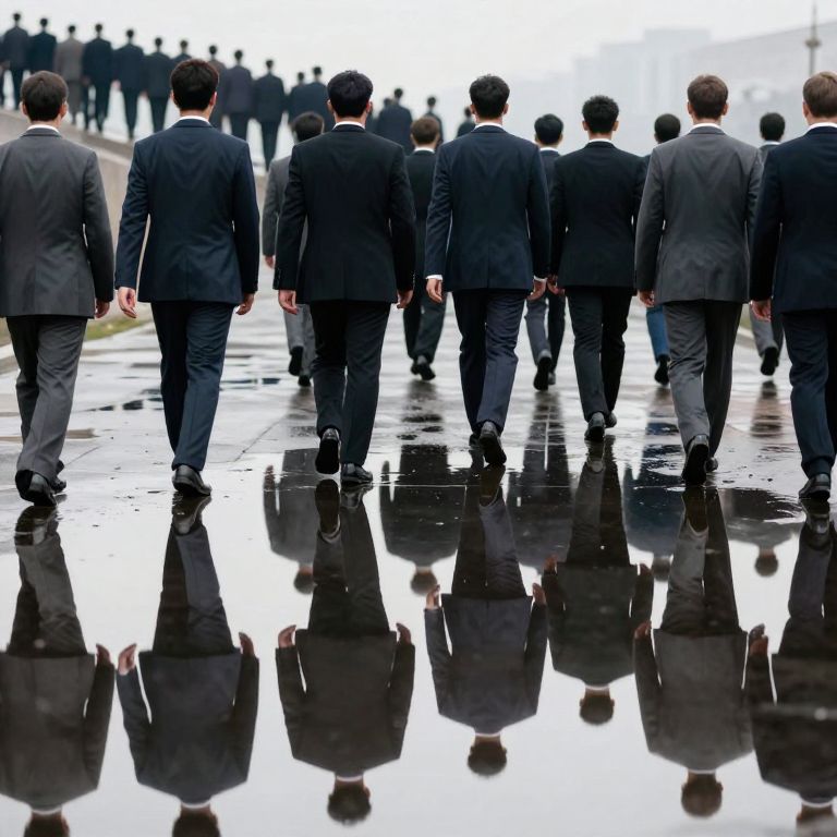 An endless procession of suited figures marches forward in unison, their reflections mirrored perfectly in a shimmering puddle below, creating a surreal duality where reality and its echo merge into an infinite, dreamlike path.