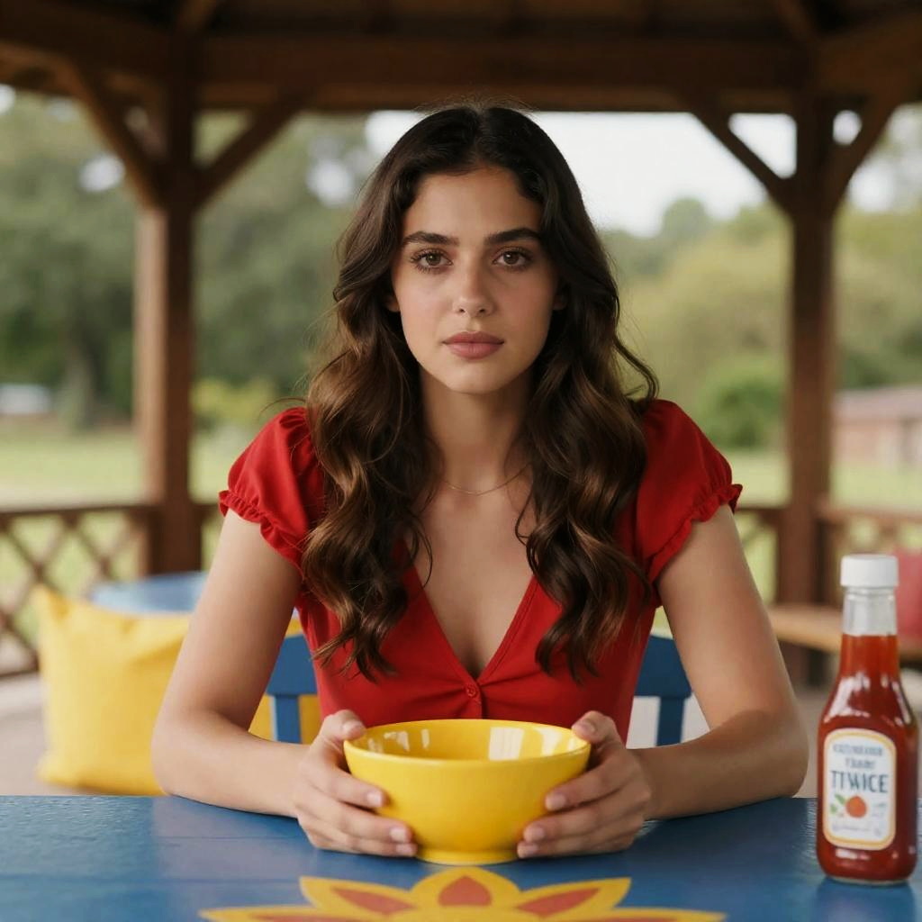 Woman with long, wavy brown hair, wearing a red, V-neck, short-sleeve top, holding a yellow bowl, sitting at a blue table with yellow and red designs, in a wooden gazebo with a lattice fence and greenery in the background. Her expression is neutral. A yellow cushion is on the left, and a ketchup bottle is on the right.