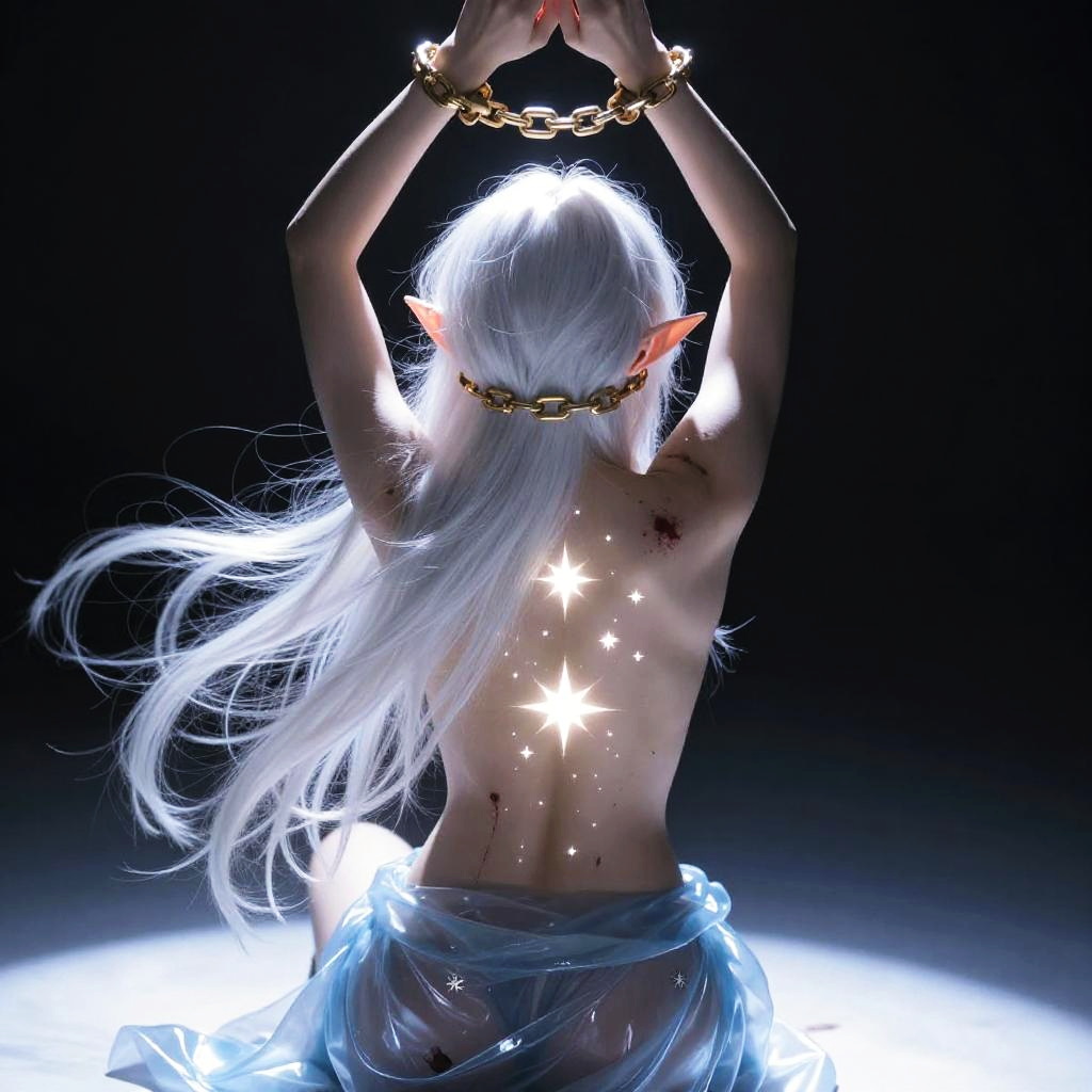 Digital art of an elf with long, flowing white hair, pointed ears, and a muscular back. They're shackled with a golden chain, arms raised above their head. Their back is adorned with glowing star tattoos, and they have a few blood stains. They're partially nude, with a blue, semi-transparent cloth covering their lower body. The background is dark, with a bright white light cutting through it.