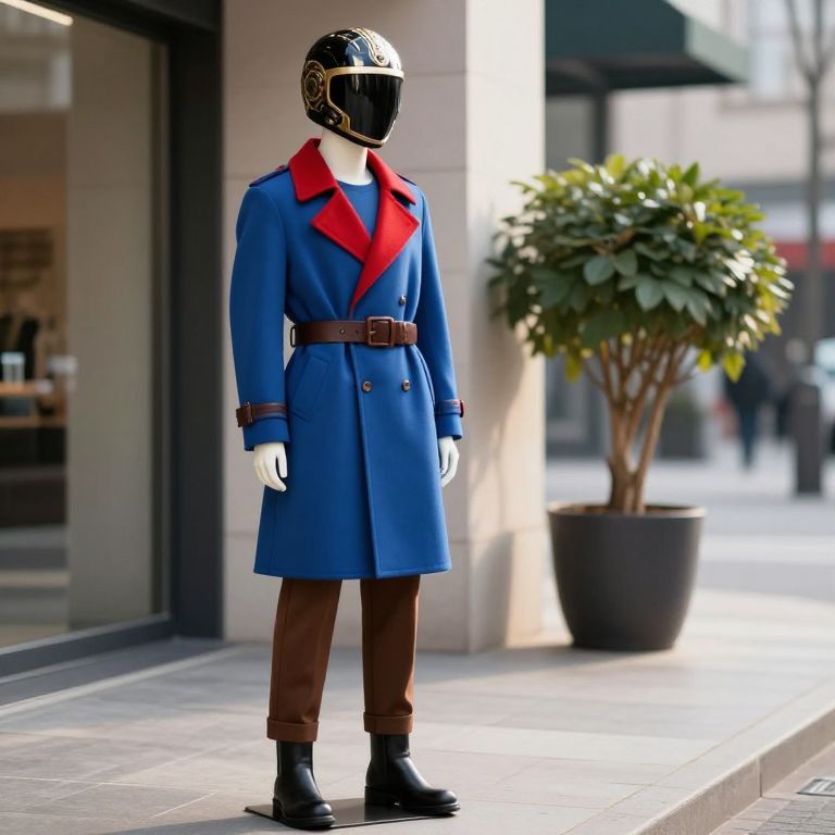 A mannequin wearing a detailed red and white outfit with a bold yellow stripe on the belt at the bottom and a black strap on the right side, complete with a red-and-white helmet securely placed on its head. The mannequin has earphones snugly fitted over its ears, giving it a tech-inspired, slightly futuristic look. It wears a serious, focused expression, as if it's in the middle of a quiet, intense moment. In the background, a busy urban environment unfolds—city buildings with modern architecture, pedestrians walking through the streets, and a vibrant, slightly blurred atmosphere. The lighting is soft daylight, casting gentle shadows, enhancing the realistic texture of the outfit and the mannequin's detailed features. The scene blends retail aesthetics with a touch of cinematic realism.