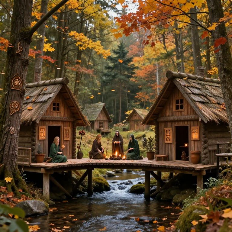Forest village DnD concept with rustic wooden houses on stilts alongside a tranquil stream, druids performing ancient rituals in a clearing, mystical symbols carved into bark, autumn leaves falling gently, vibrant earthy tones, dramatic lighting emphasizing a magical and mysterious ambiance.