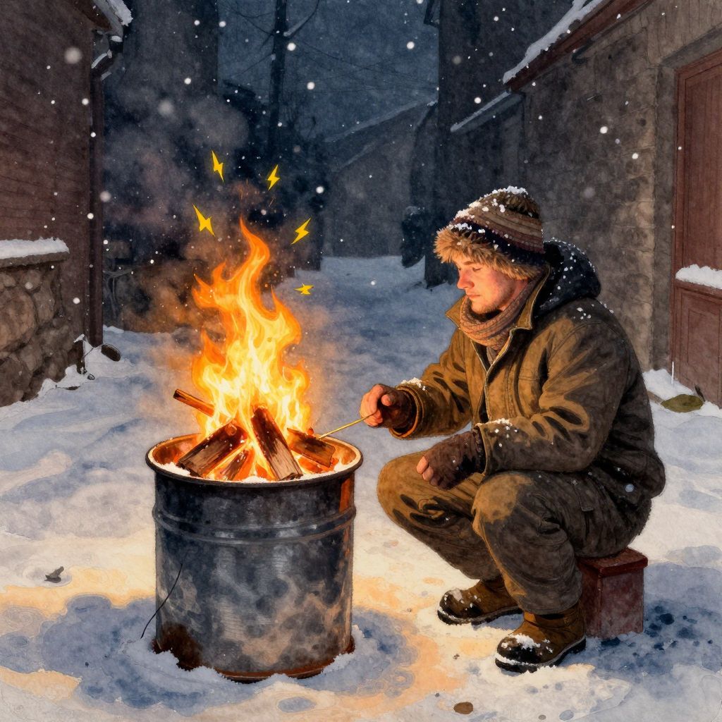 A digital painting depicts a bearded man crouching in a snowy alley at night, feeding a bright, orange fire burning in a metal barrel. He wears a brown coat, pants, and a fur-lined hat, with snowflakes gently falling around him. The alley is flanked by dark, brick buildings, and the ground is covered in fresh, white snow. The fire emits warm, yellow-orange flames and sparks, creating a stark contrast to the cold, dark surroundings. The man's focused expression and the soft glow from the fire add a sense of warmth and calm to the wintry scene.