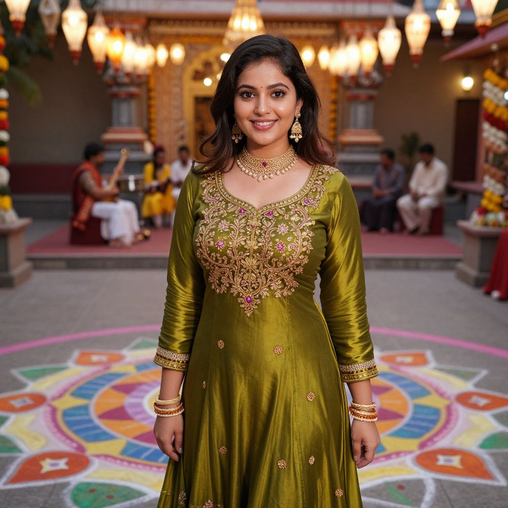 A vibrant young woman with radiant dark eyes and a playful smile wearing an anarkali suit made of moss-colored silk with gold embroidery, standing in front of a traditional rangoli pattern on the floor in a festive temple square, the setting glowing with lanterns and cultural music in the background.. The woman has big tits and cute face