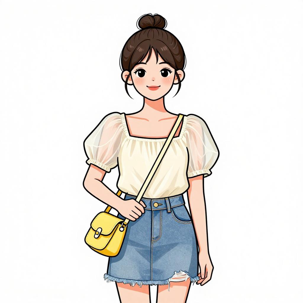 Digital drawing of an anime-style young woman with fair skin and dark brown hair in a high bun. She wears a semi-sheer white blouse with puffed sleeves and a high-waisted, blue denim skirt with frayed edges. She carries a small, yellow crossbody bag with a strap over her right shoulder. Her expression is friendly with a slight smile. The background is plain white, emphasizing the character. The art style is colorful and clean, with bold outlines and soft shading.