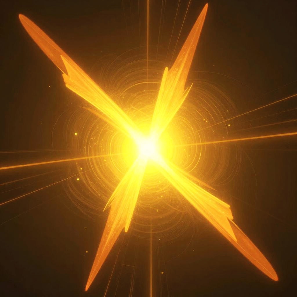This is a digital, abstract image featuring a bright yellow, glowing center with three elongated, orange-yellow, wing-like shapes radiating outward. The background is a dark brown with intricate, glowing lines and small, sparkling yellow dots surrounding the central light. The image has a cosmic, energetic feel, with a focus on bright, warm colors and dynamic movement.