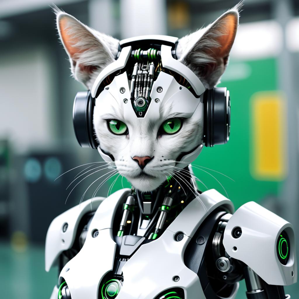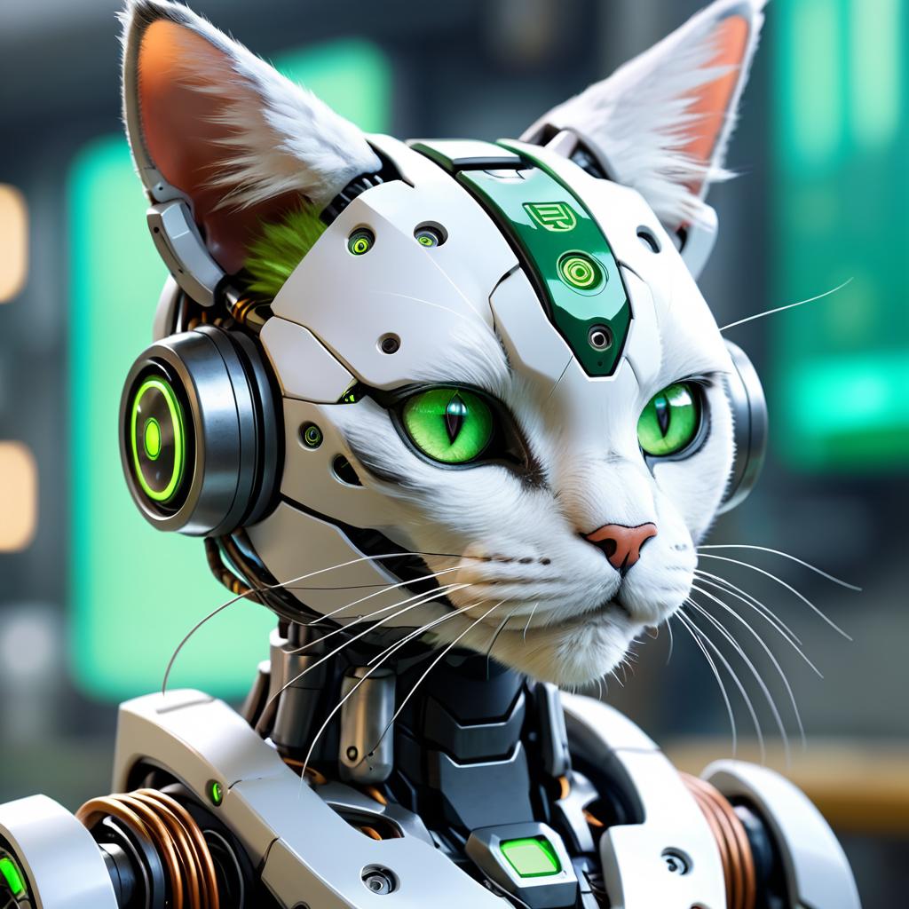 Close-up of a sci-fi humanoid robot featuring a white cat's head with green eyes, mechanical parts, and cables. The android has detailed robotic joints and animal ears with whiskers, combining feline features with advanced robotic design. The background is blurred, emphasizing the robotic feline's upper body and cyborg elements.