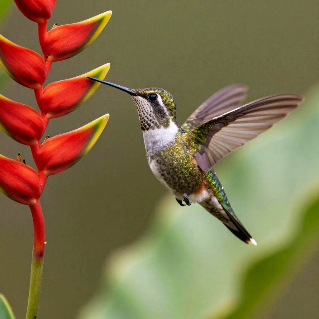 Hembra, an elegant female hummingbird hovering near vivid tropical flowers, intricate feather details, bright natural colors, high resolution, soft blur background for depth, nature photography style