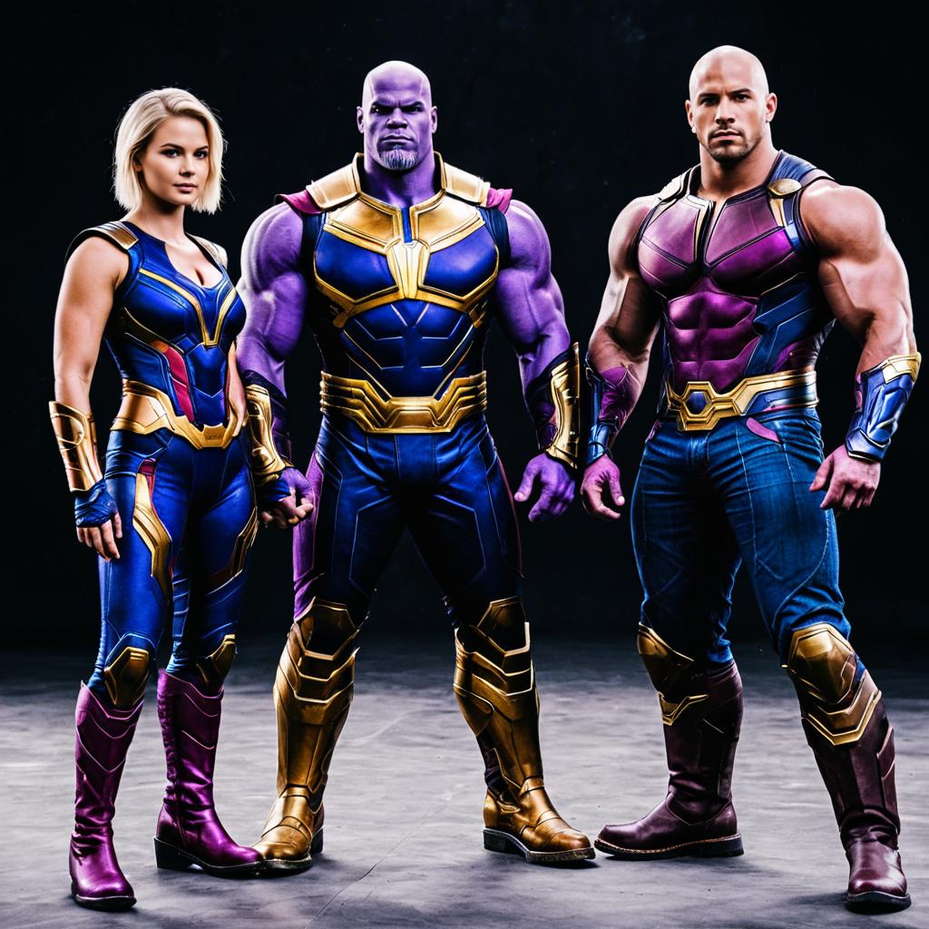 Three individuals in detailed cosplay costumes resembling Thanos and his siblings. The central figure has purple skin and wears gold and blue armor with matching boots. To the left, a blonde woman in coordinated blue, gold, and purple armored suit and boots. To the right, a muscular bald man wearing purple and gold armor with blue jeans and boots. All characters exhibit strong, muscular physiques and serious expressions against a dark background.