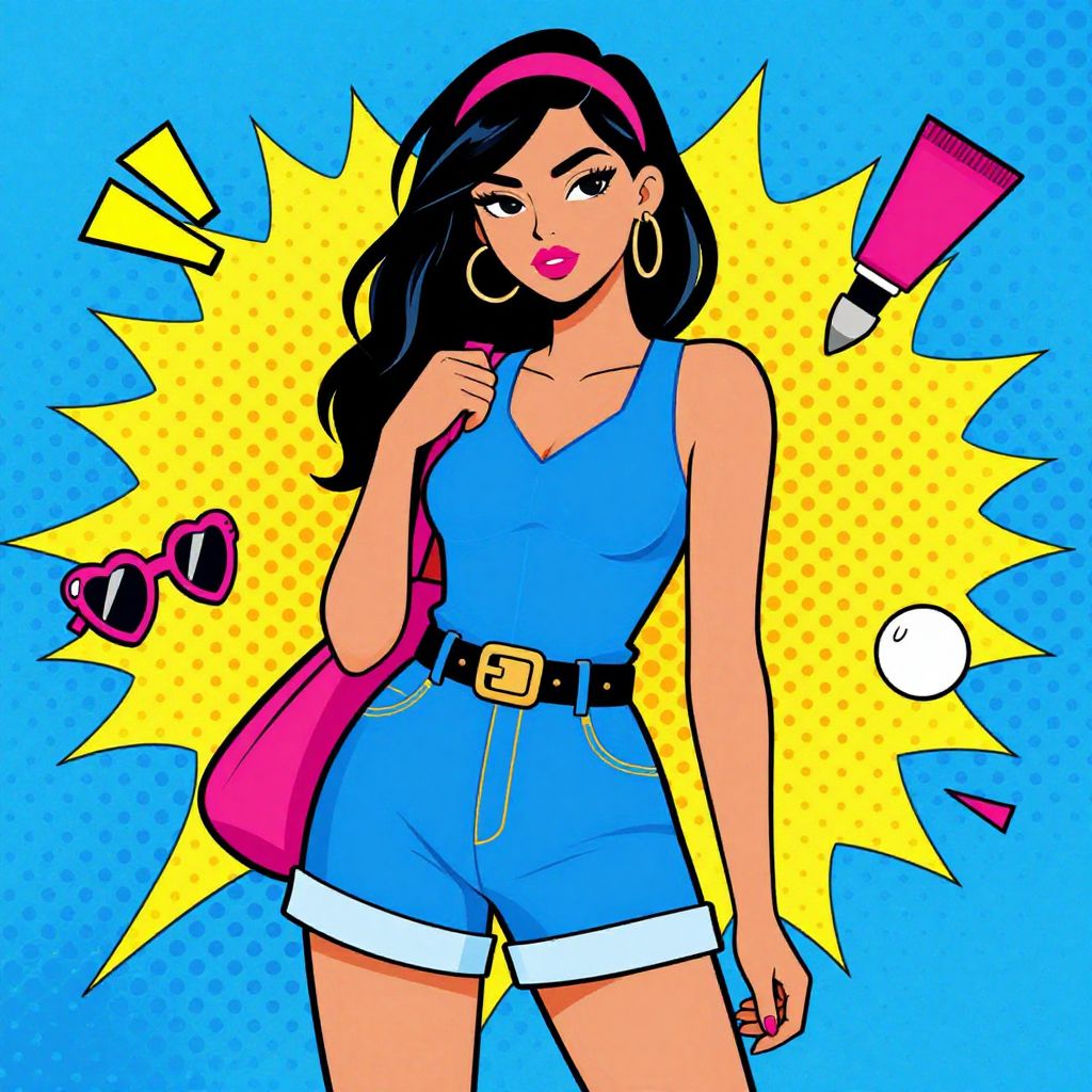 Digital pop art of a confident woman with black hair, pink headband, blue romper, and belt, against a yellow burst background.
