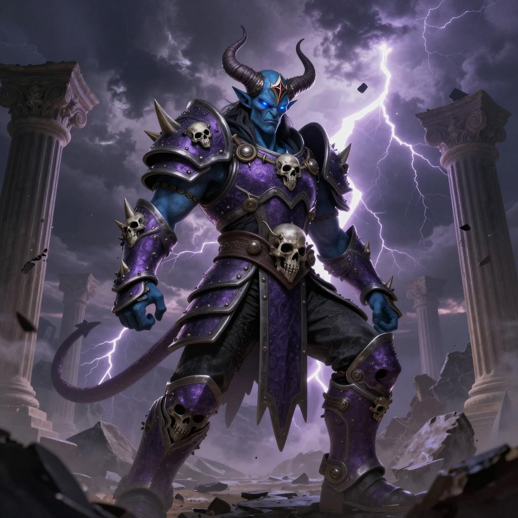 A powerful dark fantasy demon warrior illustrated with blue skin and glowing eyes, adorned in spiked purple armor embedded with skull motifs. The warrior stands confidently on shattered ruins, surrounded by ancient columns under a dramatic stormy sky filled with striking lightning and ominous clouds.