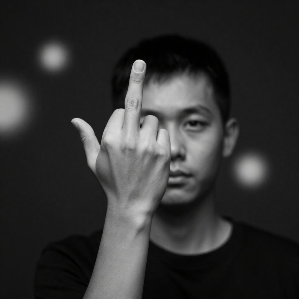 Black and white photograph of an Asian man with short dark hair wearing a black shirt. He raises his right hand towards the camera with the middle finger extended in a defiant gesture. The background is dark with subtle blurred circular light spots, emphasizing the high-contrast, moody atmosphere of the image.