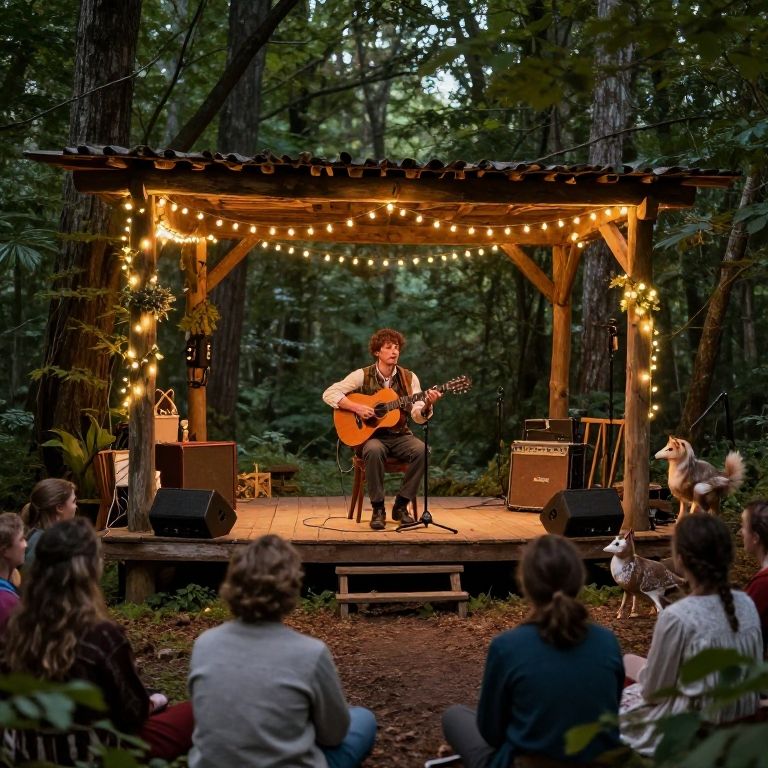 Musician performing on a rustic wooden stage in a forest clearing illuminated by fairy lights, surrounded by nature and attentive animals, blending folk music ambiance with magical realism, soft, warm tones and intricate details.