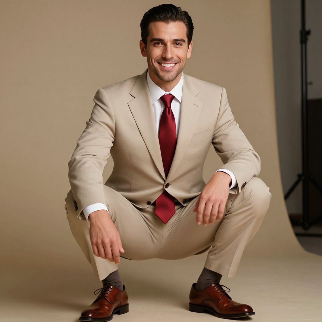 A handsome man in his late 20s, with slicked-back dark hair and a confident smile, wearing a perfectly tailored beige suit, a vibrant red silk tie, and polished brown leather shoes. The lighting is warm and professional.