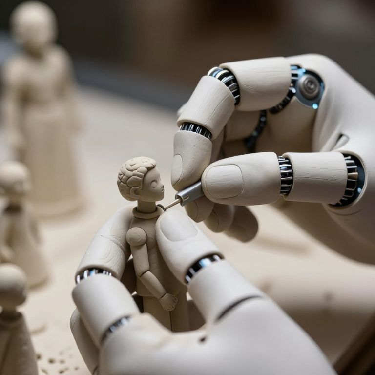 AI hands art focusing on close-up, highly detailed robotic fingers delicately sculpting clay figures, illuminated by soft studio lighting, emphasizing the precision and subtlety of AI-powered creativity in a hyper-realistic visual style.