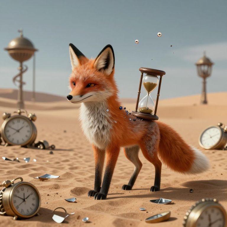 A melancholic clockwork fox adjusts tiny hourglasses on its tail to rewrite fragments of local gravity as it strolls through a desert of shattered timepieces.
