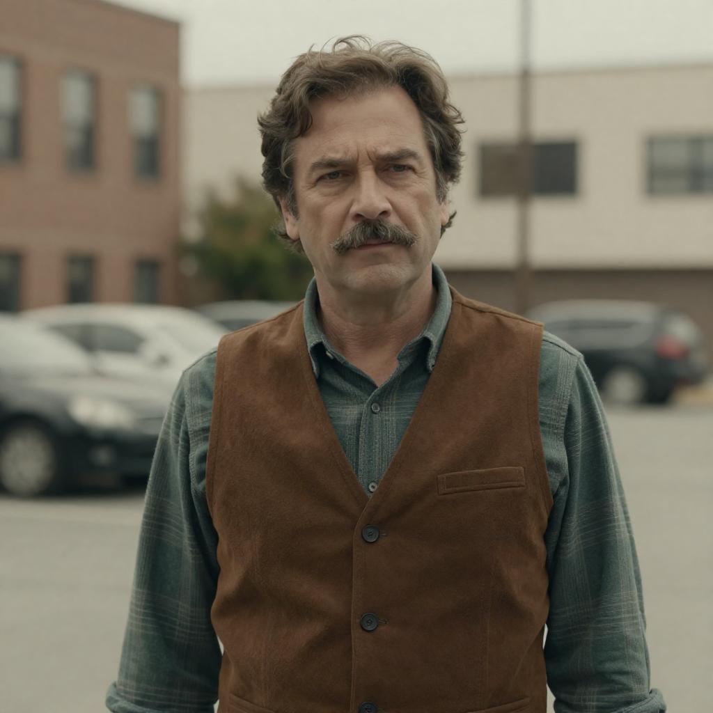 Photograph of a middle-aged man with a mustache, reflected in a circular mirror. He has light skin and brown hair. The background is a blue-tinted interior with a black window frame on the right. The image has a high-contrast, digital art style.