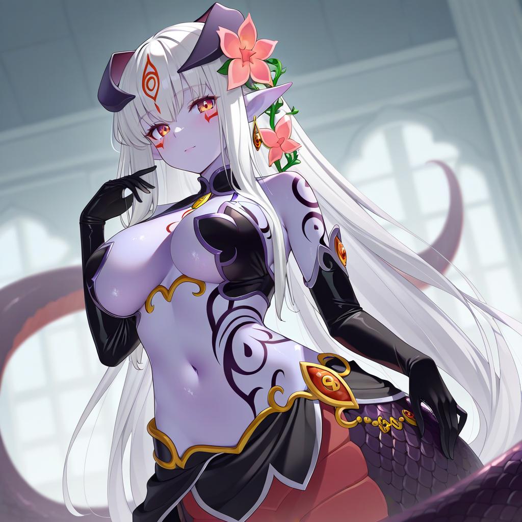 Alipheese fateburn xvi, mon-musu quest!, 1girl, purple skin, pointy ears, horns, yellow eyes, hair between eyes, eye tattoo, white hair, very long hair, long hair, hair tattoo, hair flower, large breasts, breast tattoo, navel, stomach tattoo, facial tattoo, elbow gloves, black gloves, black skirt, lamia, scales, single earring, by artist kanpa (campagne 9), illustrious
