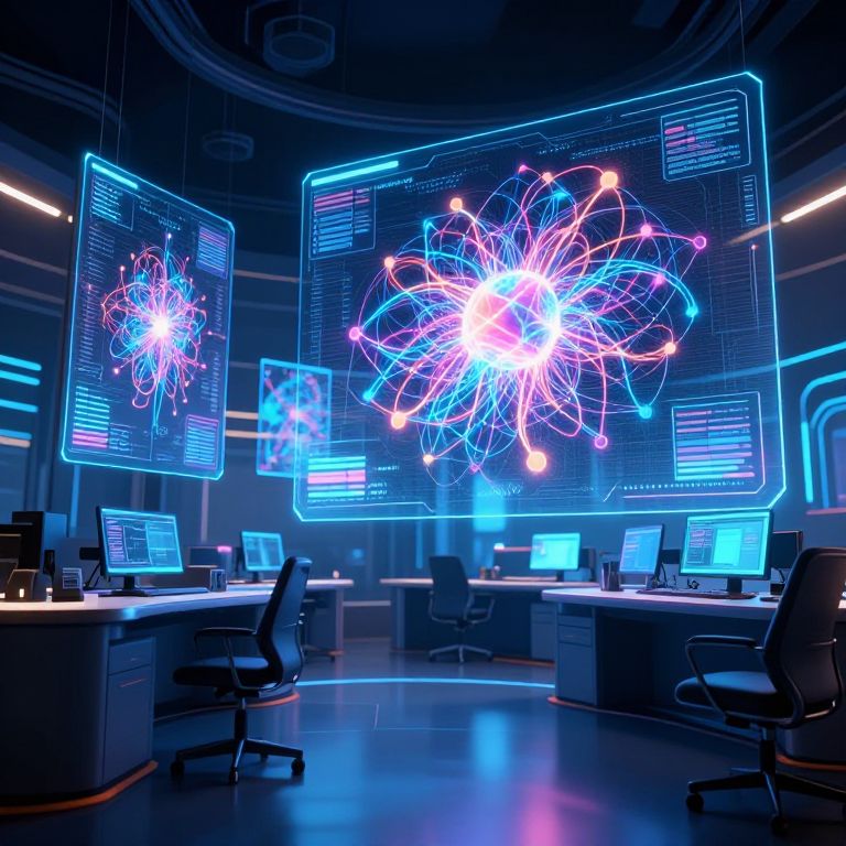 Photograph of a futuristic, high-tech control room bathed in blue and neon lights. Four large, illuminated screens display complex, colorful, abstract patterns resembling cosmic explosions. The room has multiple white desks with black swivel chairs, each equipped with glowing blue computer monitors. The walls and ceiling have sleek, curved designs with embedded light panels. The floor reflects the vibrant lights, enhancing the sci-fi atmosphere. The overall scene exudes a sense of advanced technology and futuristic innovation.