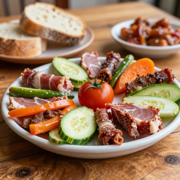 Traditional Alaves cuisine served on rustic wooden table, close-up of a hearty pintxo platter with fresh vegetables, meats, and artisanal bread, warm natural lighting, inviting and colorful food photography style.