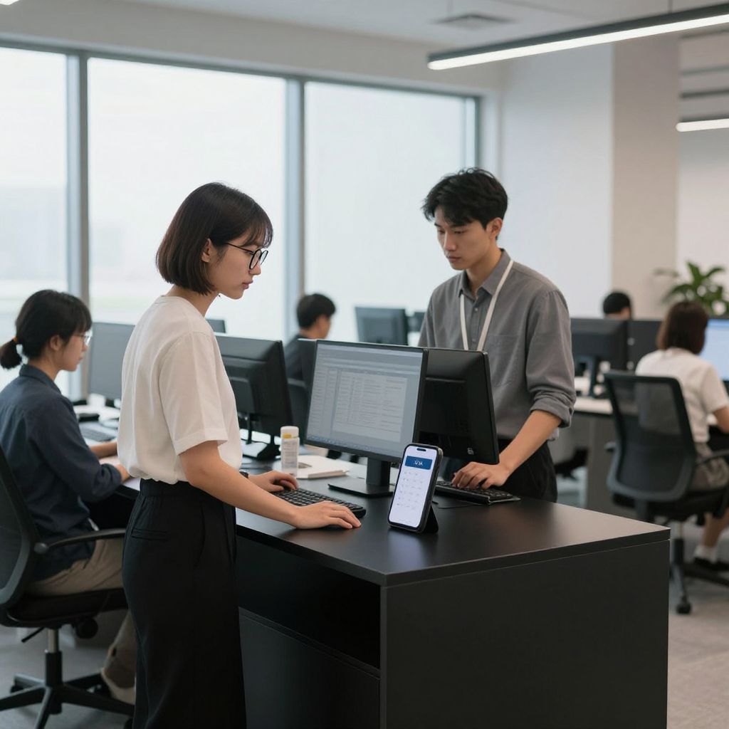 A clean, minimalist service counter in a modern tech company office, where a young woman in her 20s with short, dark hair and glasses is assisting colleagues with workstations. The counter has a matte black surface with a small digital display showing time and notifications. The office has floor-to-ceiling windows, soft lighting, and a professional yet friendly atmosphere.