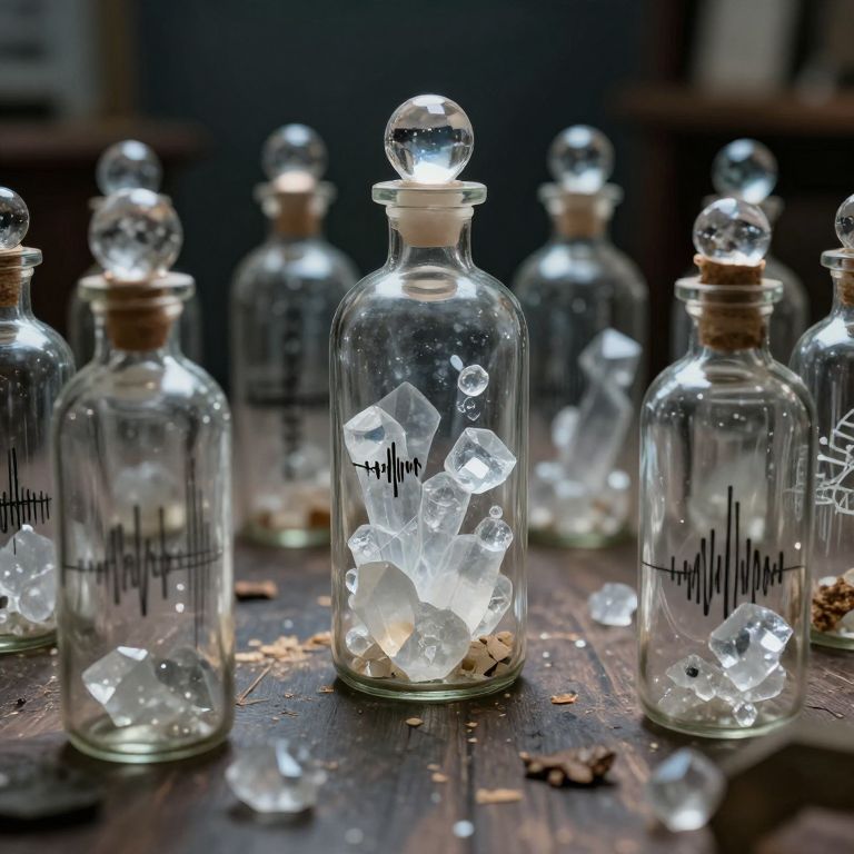 Photograph of eight clear glass bottles with cork stoppers, each containing glowing white crystals and small pebbles. Black line graph patterns are etched onto the bottles. The bottles are arranged on a rustic wooden surface, with scattered crystals and pebbles around them. The background is dark, creating a contrast that highlights the illuminated crystals. The bottles are centrally focused with some slightly blurred in the background, creating depth. The overall lighting emphasizes the glowing crystals, adding a magical or ethereal feel to the scene.