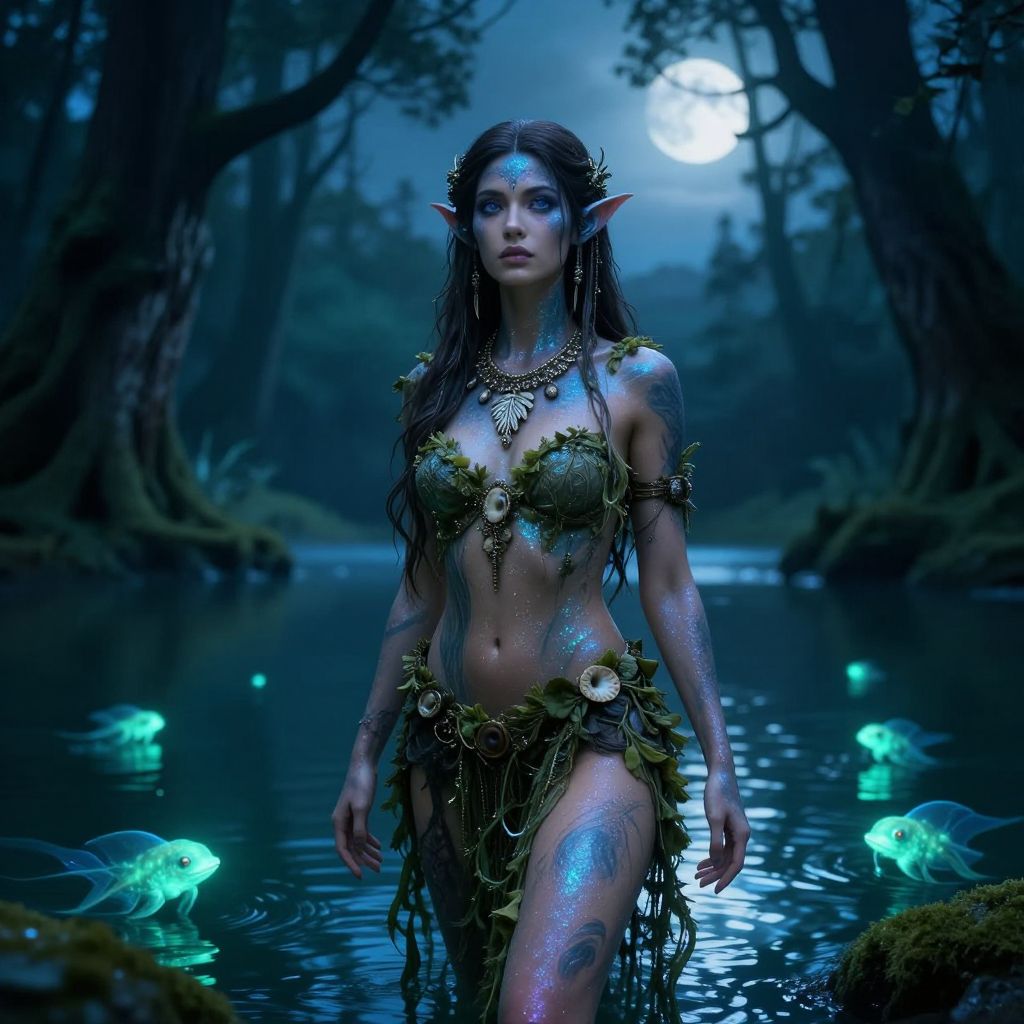 Portrait creator capturing a mythical forest spirit, surrounded by glowing flora and shimmering particles, intricate tribal patterns painted on the subject’s face, mystical ambiance with a twilight color scheme, highly detailed fantasy portrait with surreal natural elements.