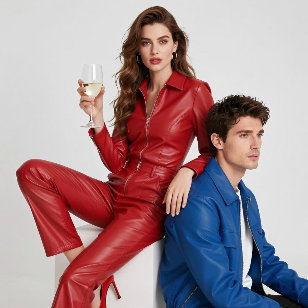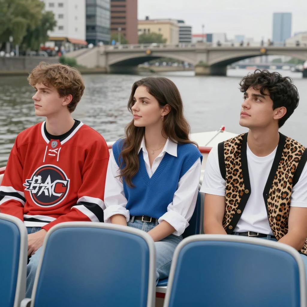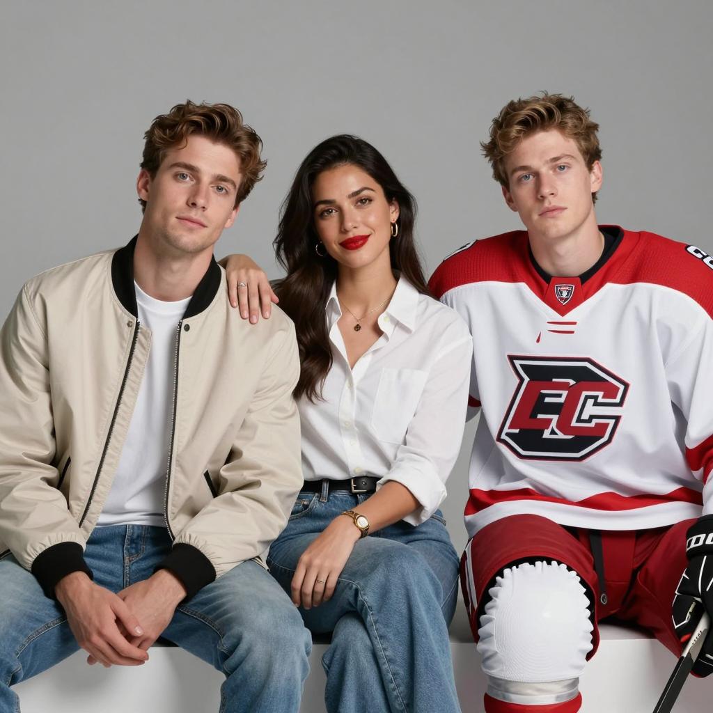 Three people sitting close together. A man in a beige and black jacket, white t-shirt, and blue jeans sits on the left. A woman with dark hair, red lipstick, and a white shirt sits in the middle, her arm around the man. A man in a red and white hockey jersey with "CO" on the sleeve sits on the right. They are against a smooth, gray background. The woman has a slight smile, the man on the left has a relaxed expression, and the man on the right looks serious.