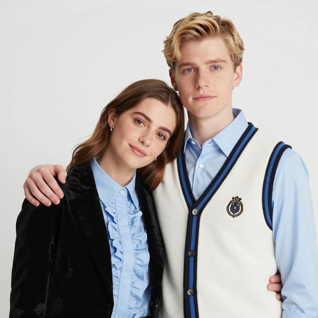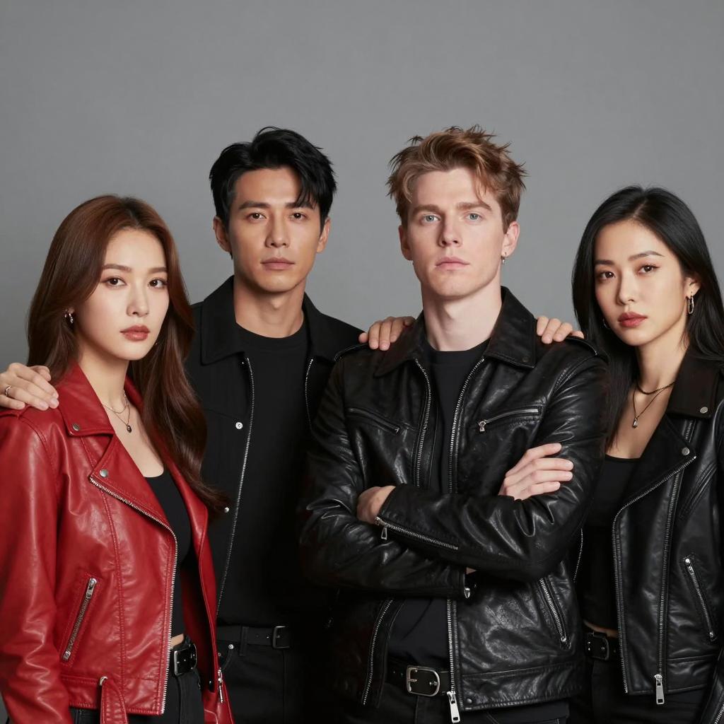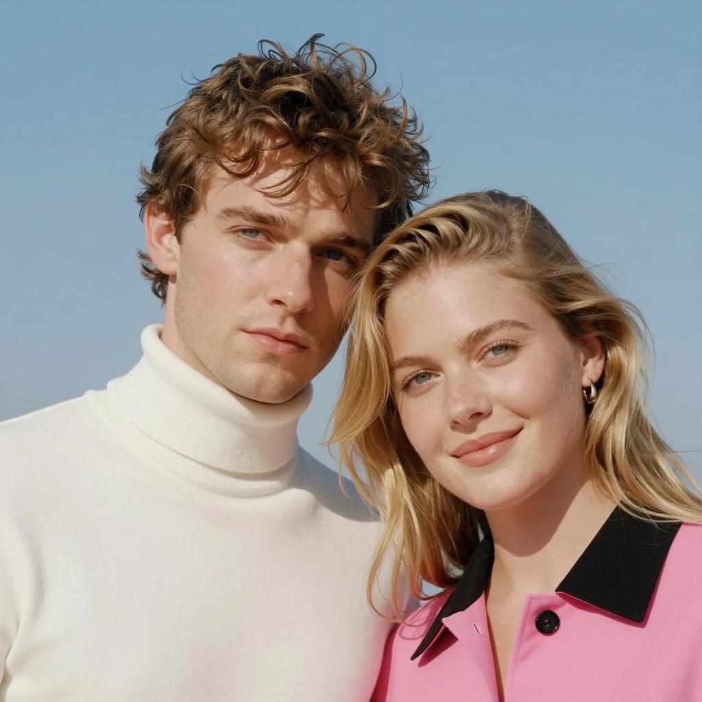 Three people sitting close together. A man in a beige and black jacket, white t-shirt, and blue jeans sits on the left. A woman with dark hair, red lipstick, and a white shirt sits in the middle, her arm around the man. A man in a red and white hockey jersey with "CO" on the sleeve sits on the right. They are against a smooth, gray background. The woman has a slight smile, the man on the left has a relaxed expression, and the man on the right looks serious.