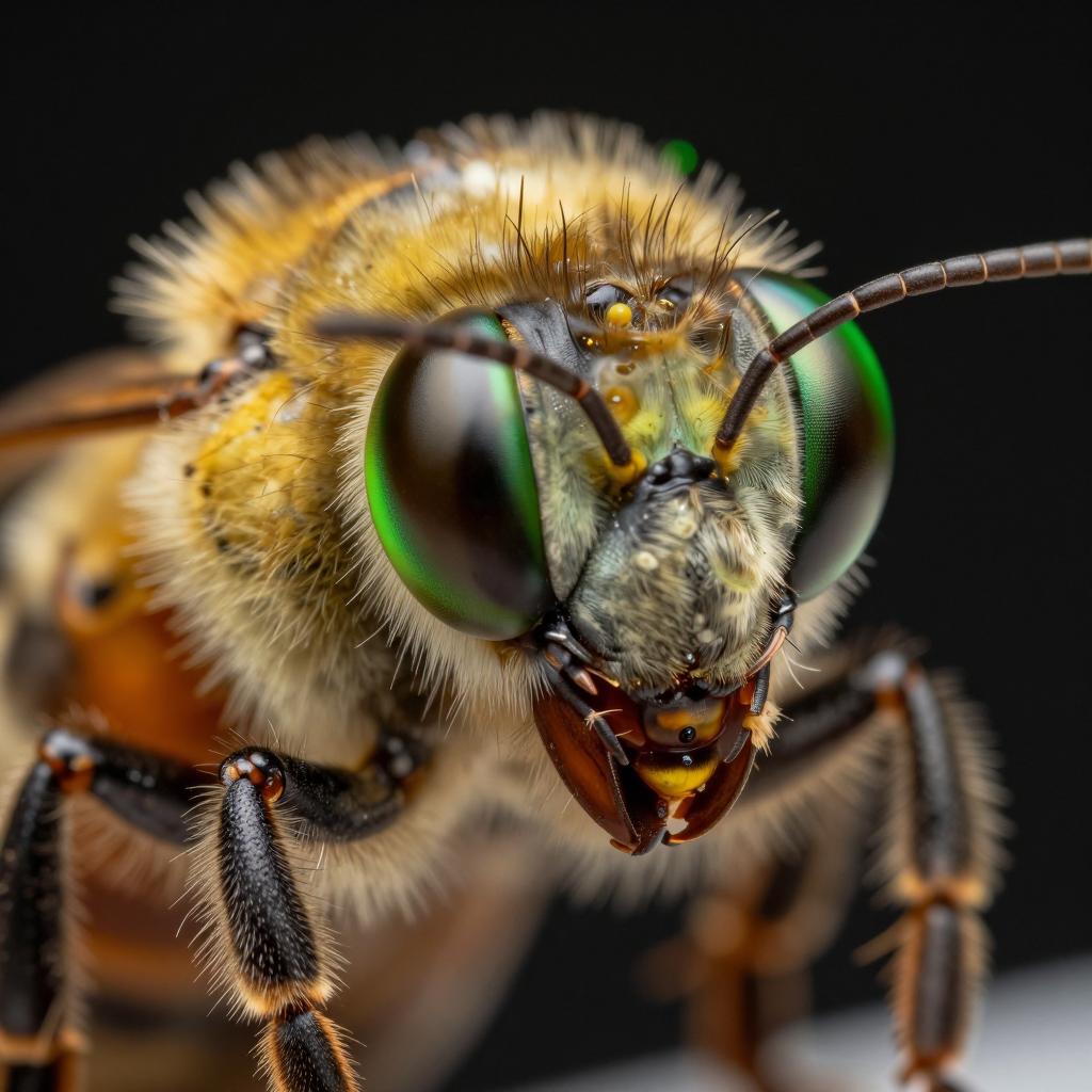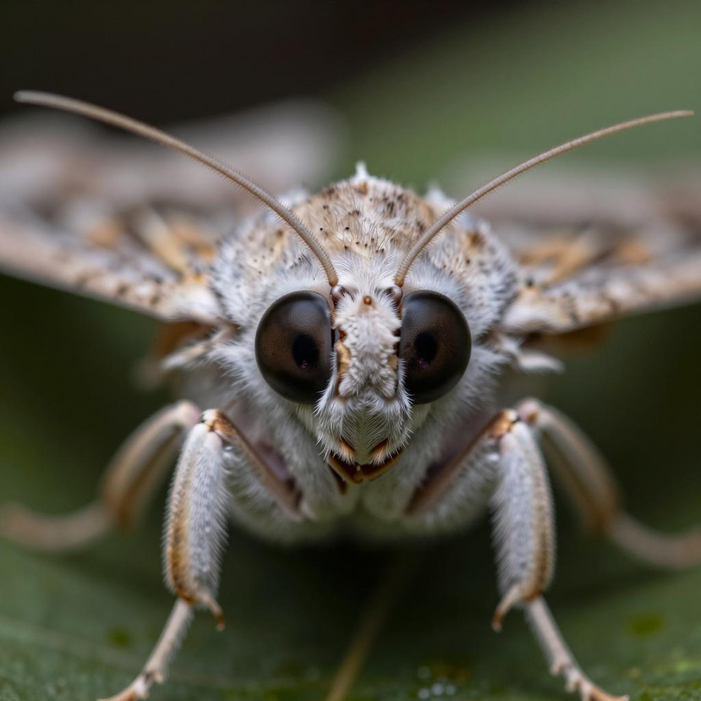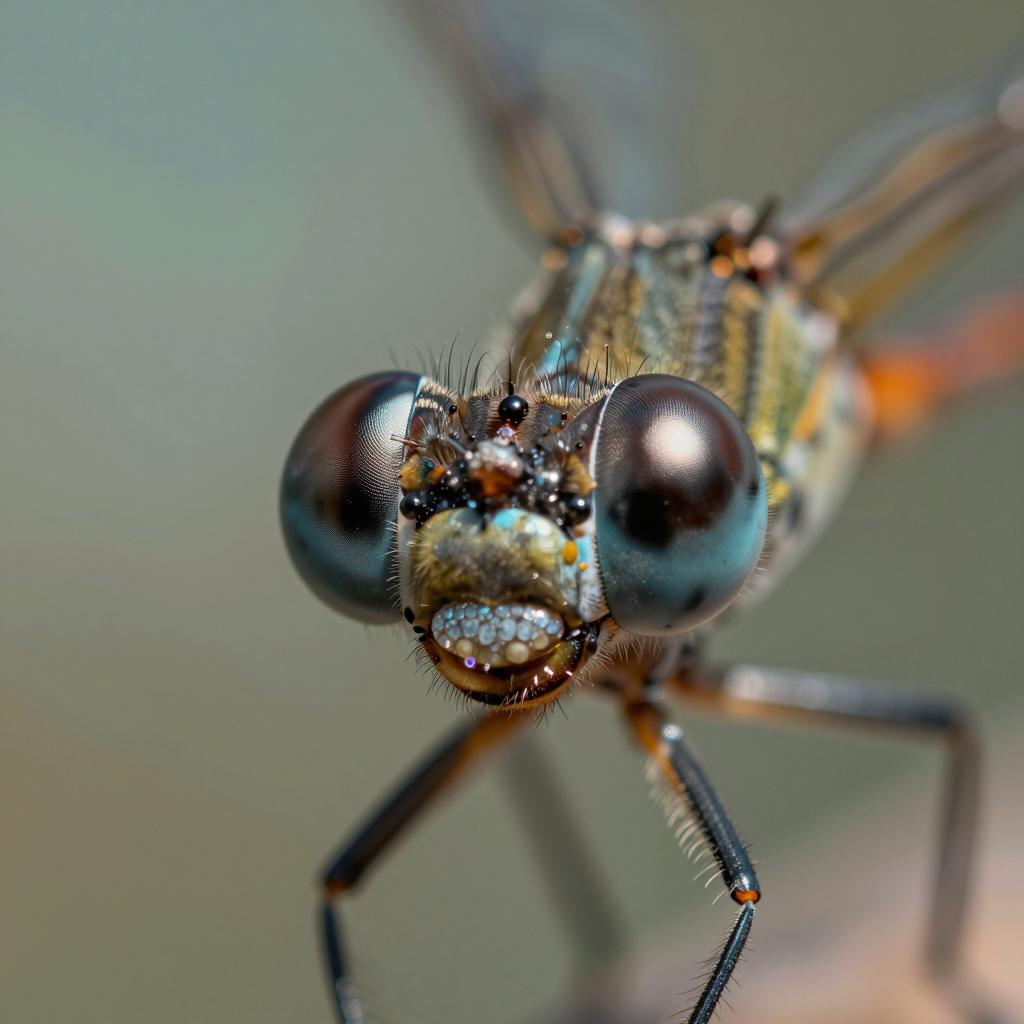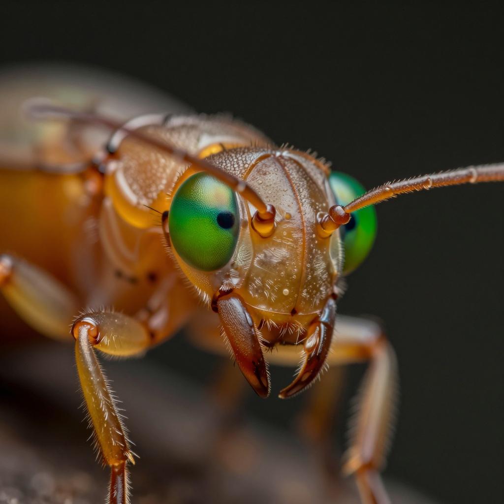 Ultra-macro close-up of lacewing face, hyper-detailed compound eyes, fine antennae and mouthparts in sharp focus, eyes in warm chestnut brown with golden center, tiny hairs and textures clearly visible, shallow depth of field, dark teal fading into near-black corners, ring-light style illumination with circular catchlights, captured with professional macro lens, insanely detailed, crisp focus on eyes and head, photorealistic insect macro photography