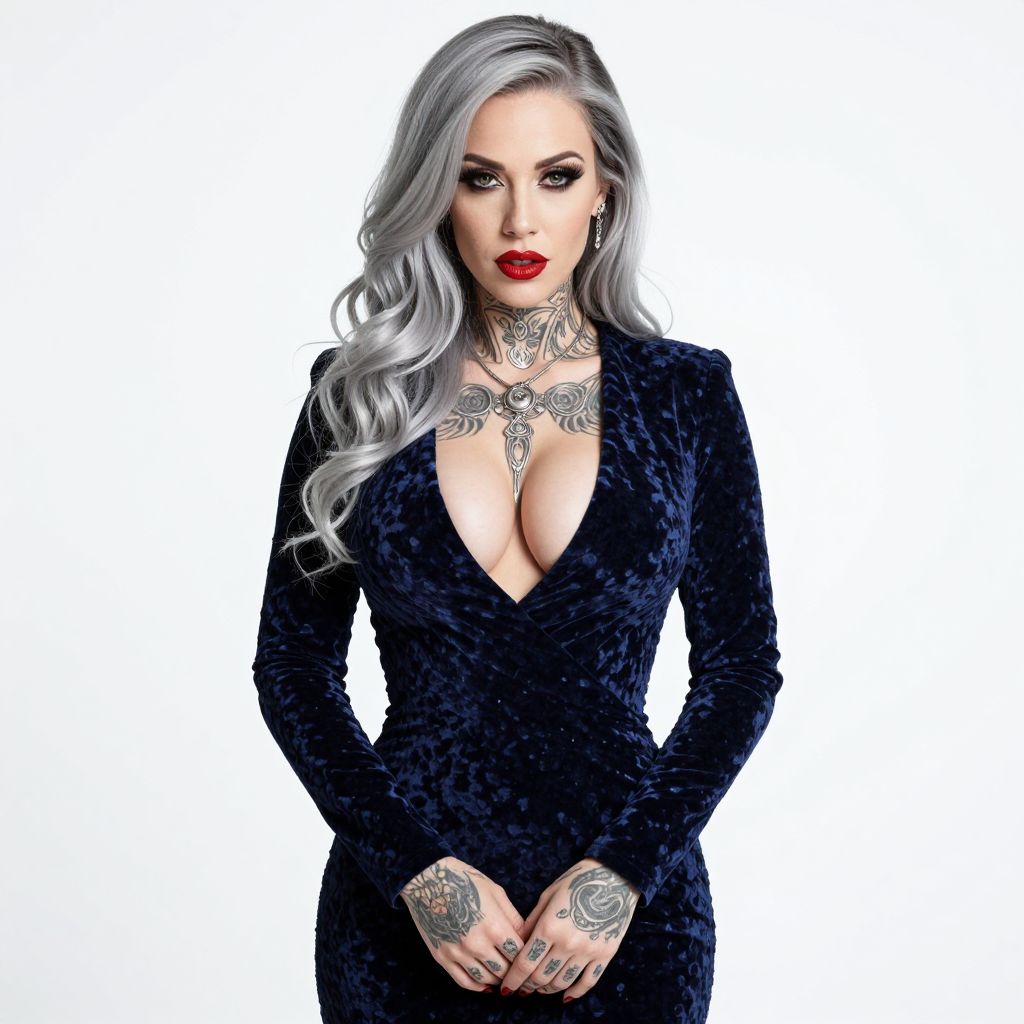 Photograph of a woman with long, wavy silver hair and pale skin. She's wearing a tight, dark blue velvet dress with a deep V-neck, showcasing her ample cleavage and intricate silver neck and chest tattoos. Her hands, also tattooed, are clasped in front of her. She has red lipstick and a serious expression. The background is a plain white, making her stand out prominently.