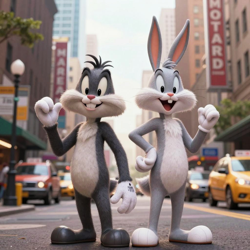 Photograph of two anthropomorphic gray rabbits in 3D animation style, dressed in brown suit and black suit with bow tie, standing on a city