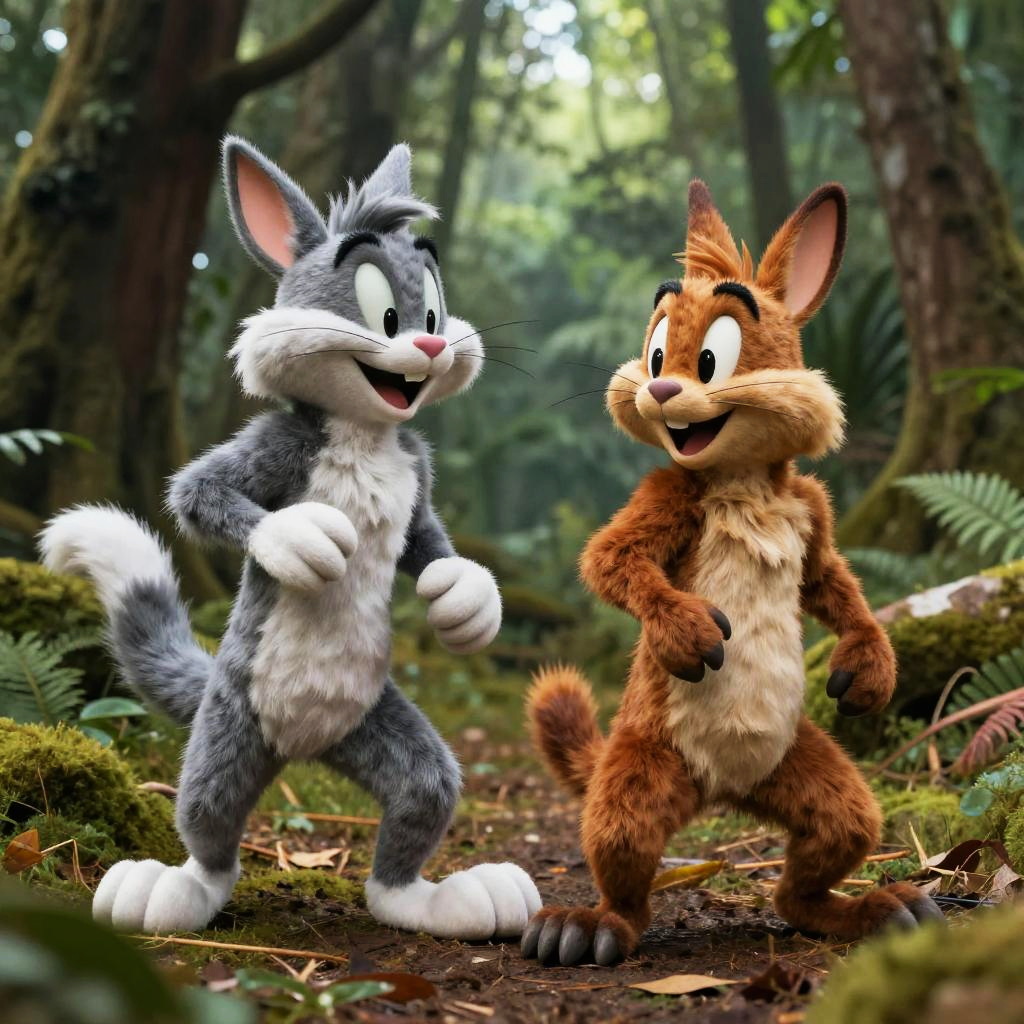 Realistic Looney Tunes characters on a vintage 1940s city street, photorealistic textures of clothing and environment, moody lighting with shadows, dynamic poses conveying classic cartoon antics with a lifelike twist, finely detailed scene