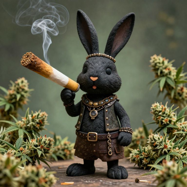 Black Hole full body stoned hippie Easter bunny smoking a gigantic huge cannabis cigarette, lots of cannabis flowers on background,