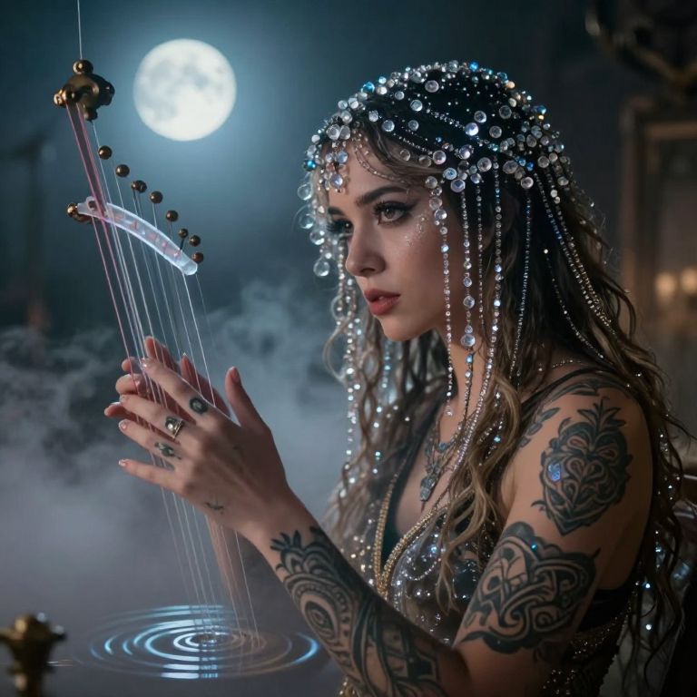 A captivating portrait of an accomplished musician with cascading hair adorned in sparkling crystals focuses on her intriguing gaze as she plays an enigmatic instrument featuring translucent strings. The dimly lit chamber shrouded by ethereal fog reveals intricate tattoos shimmering under soft moonlight. As the instrument's vibrations create ripples across the mist, this intimate performance space evokes a spectrum of emotions from curiosity and wonder to tranquility.