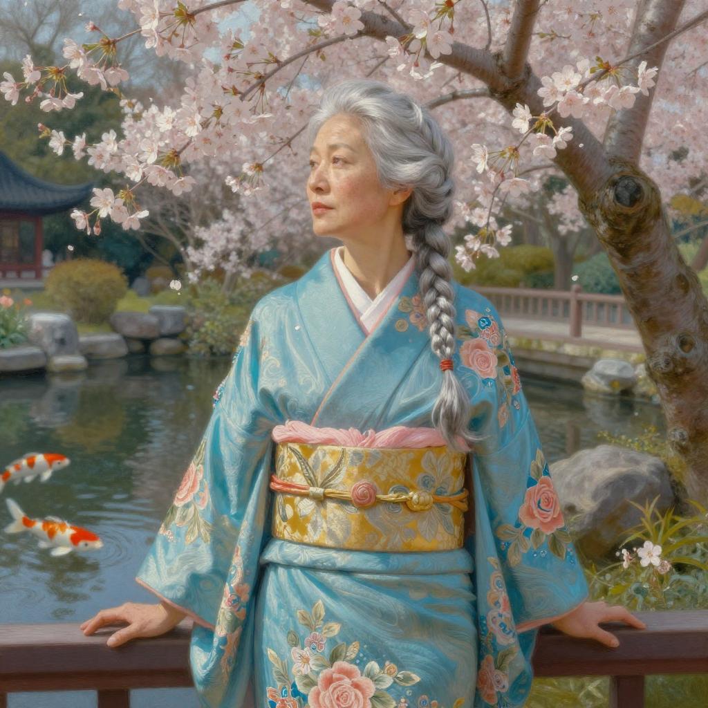 An artistic portrayal of a mature woman with braided silver hair, warm freckled skin, and a serene, contemplative expression dressed in an ornate embroidered sapphire kimono with flowing sleeves, a golden obi, and subtle rose motifs, standing on a sunlit veranda overlooking a tranquil koi pond surrounded by blooming cherry blossoms, rendered in a dreamlike oil painting combining Pre-Raphaelite detail and Art Nouveau curves, soft natural light and rich painterly textures.