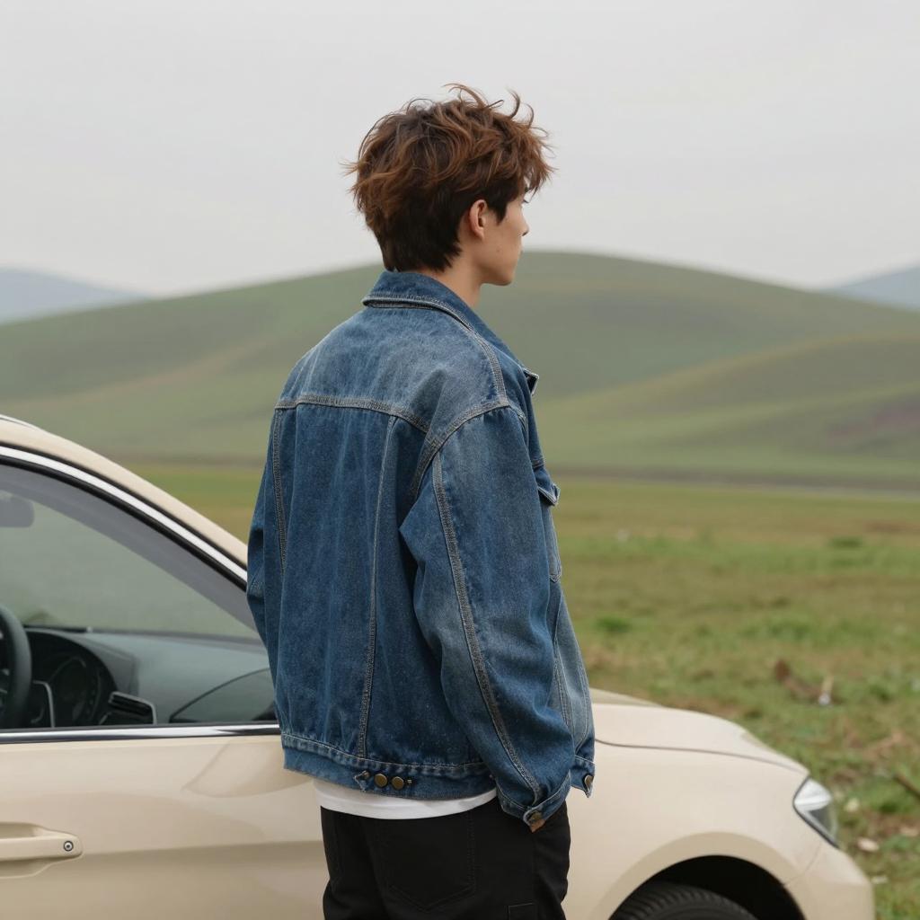 Male singer with light brown hair, wearing a red jacket over a blue shirt and blue jeans, holding a microphone, standing on stage, foggy background. Foreground shows blurred heads of audience. Singer's expression is focused. Two hands in foreground.