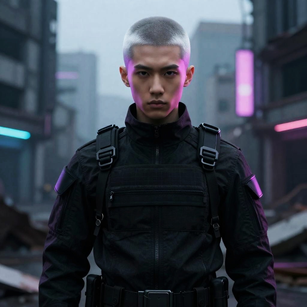 Realistic photo.portrait of a futuristic soldier, anime style, buzzed silver hair, straight on, by Artgerm, James Jean, Tom Bagshaw, Gerald Brom, vaporwave colors, lofi colors, moody goth vibe, war-torn city ruins, 4K, HD realistic photo