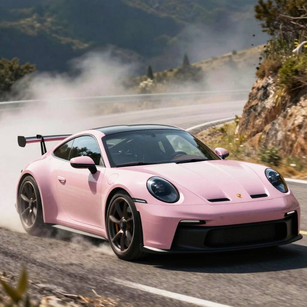 Detailed close-up of a pink Porsche 992 GT3, focusing on front grille, headlights, and aerodynamic features, studio lighting with soft shadows, ultra-realistic textures, emphasizing luxury sports car craftsmanship