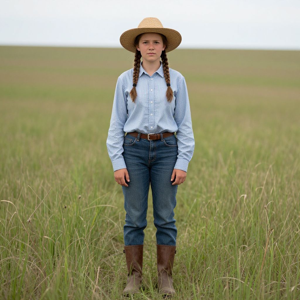 Photograph of a young Caucasian girl with fair skin and brown braided hair, wearing a light blue, long-sleeved, button-up shirt, dark blue jeans, brown belt, brown leather boots, and a straw hat. She stands in a tall, green grass field with a blurred, open horizon in the background. Her expression is neutral, and she stands with her arms relaxed at her sides. The image has a natural, outdoor setting with soft, diffused lighting, highlighting the simplicity and rustic charm of the rural landscape.