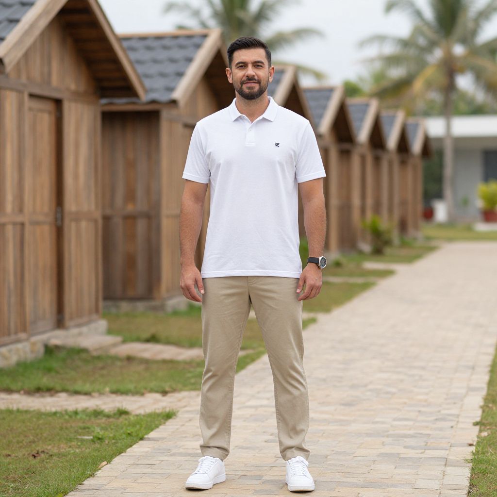 Photograph of a bearded man with dark hair, wearing a white polo shirt, beige pants, and white sneakers, standing on a tiled path in