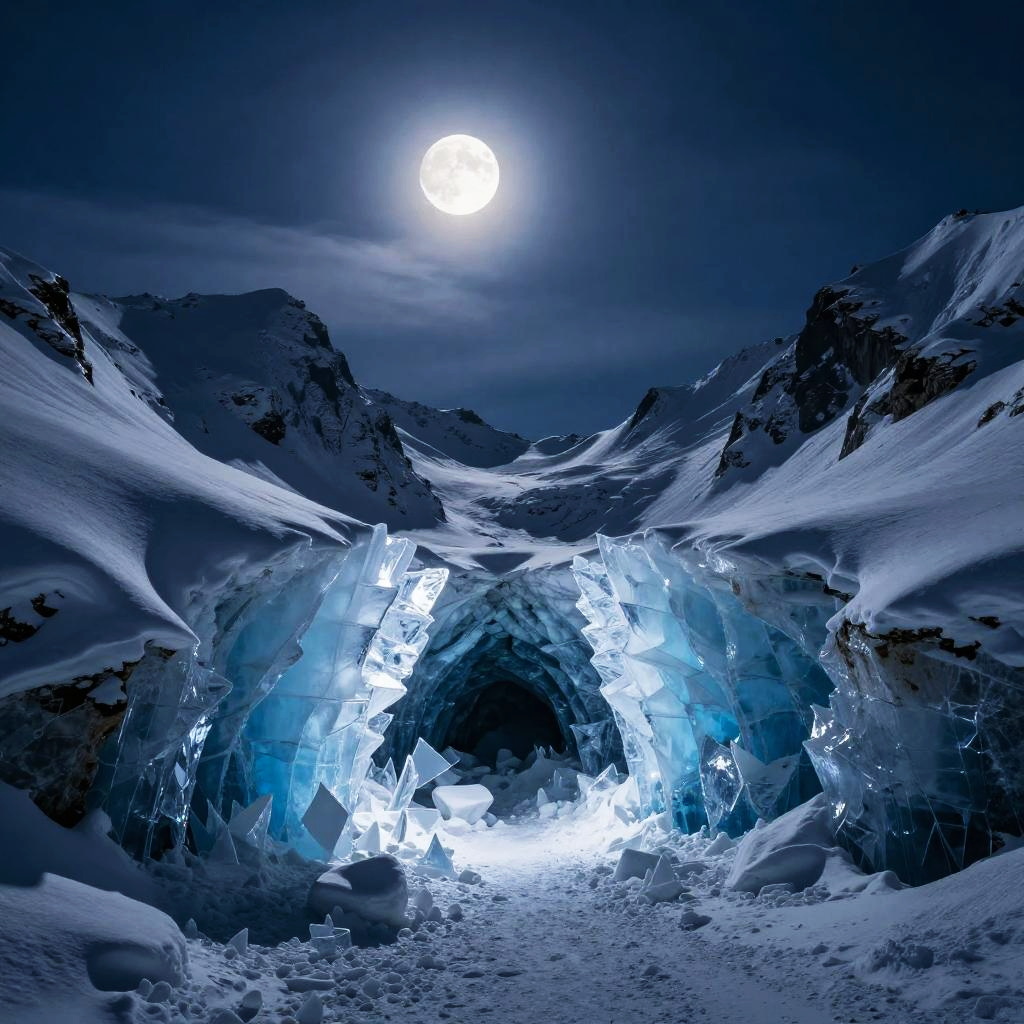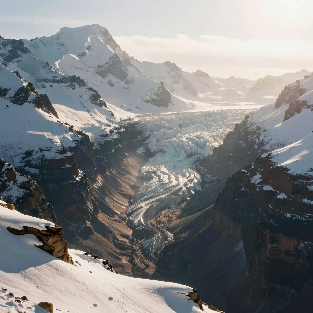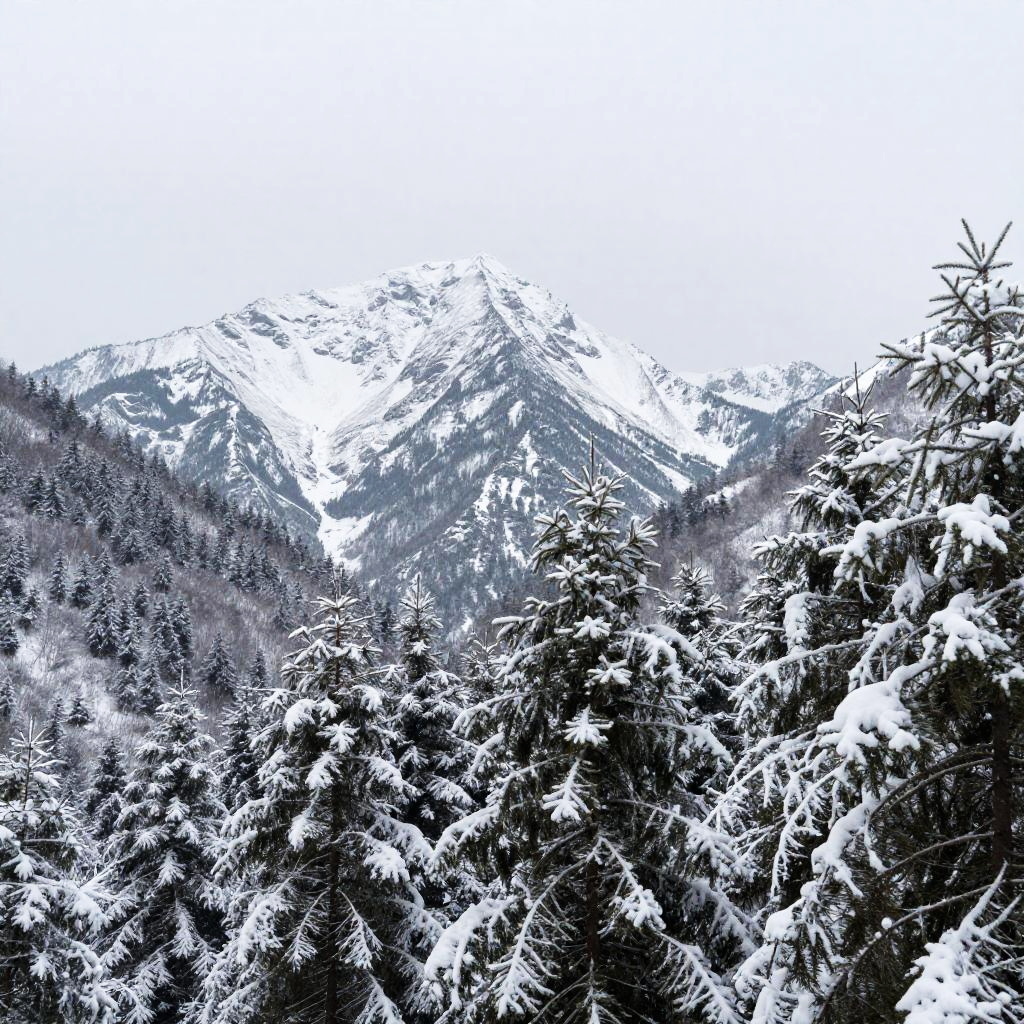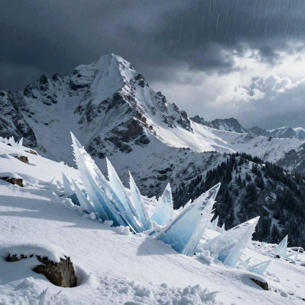 Snow-Capped Peaks, sharp ice shards, steady freezing rain, dim afternoon, Digital surrealism with sharp lighting contrasts