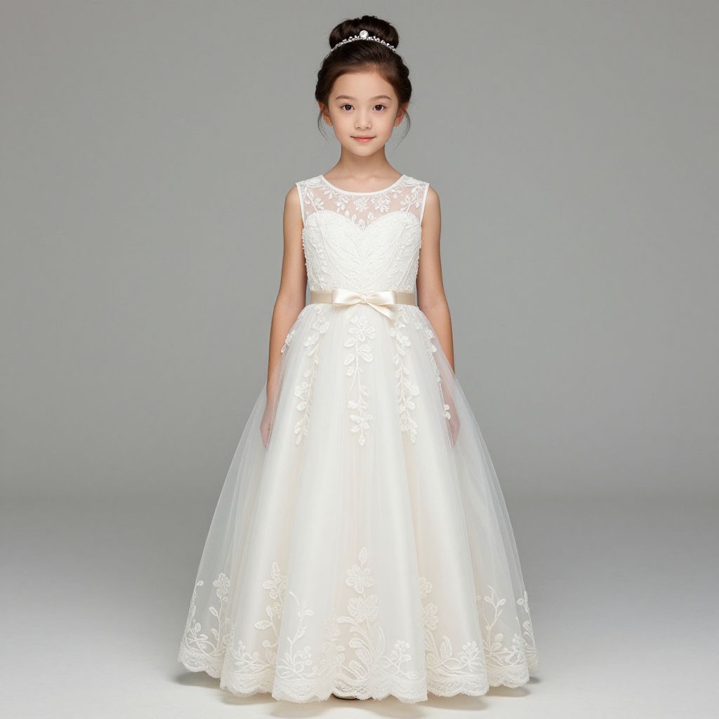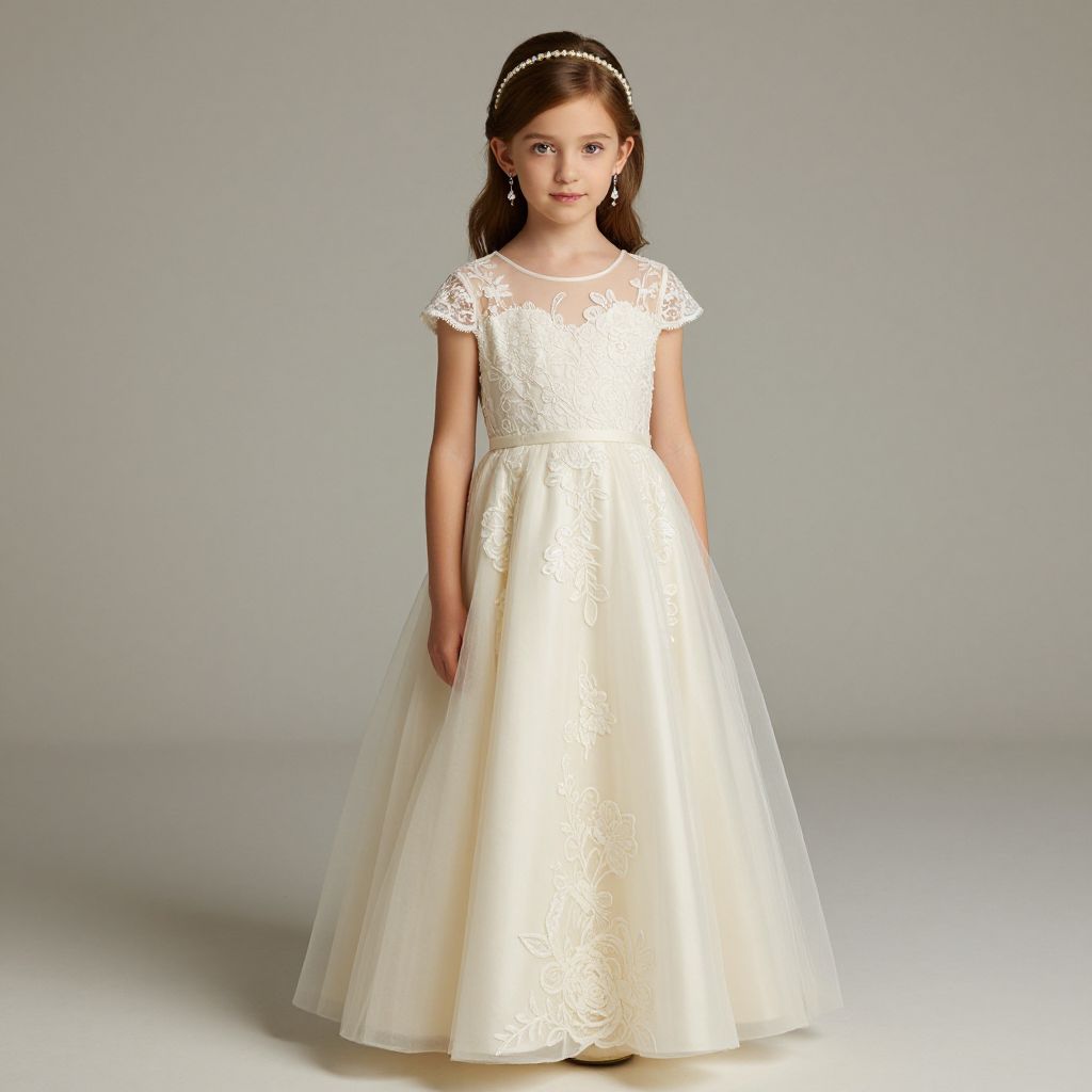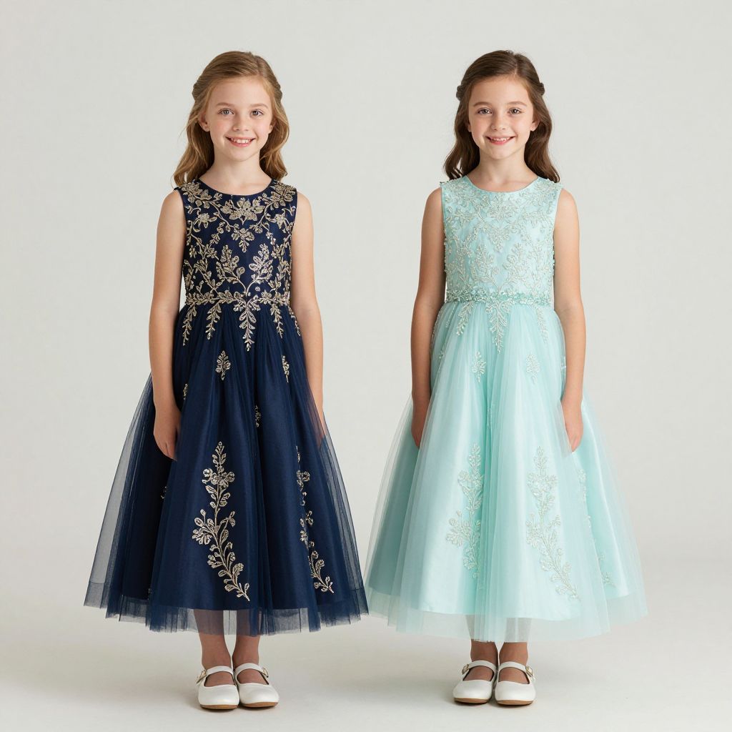 Two young girls stand side by side, smiling brightly while wearing elegant, sleeveless wedding dresses—one in navy blue with gold floral embroidery and the other in mint green with delicate floral patterns, both featuring layered tulle skirts and complemented by white shoes.