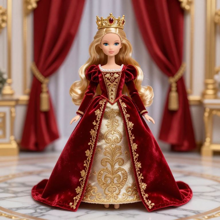 A photo of a doll with long, wavy blonde hair, wearing a gold crown and a red velvet gown adorned with intricate gold patterns. The gown has long sleeves and a flowing train. She stands in an ornate room with marble floors, gold accents, and heavy red curtains in the background. The doll's expression is calm and regal.