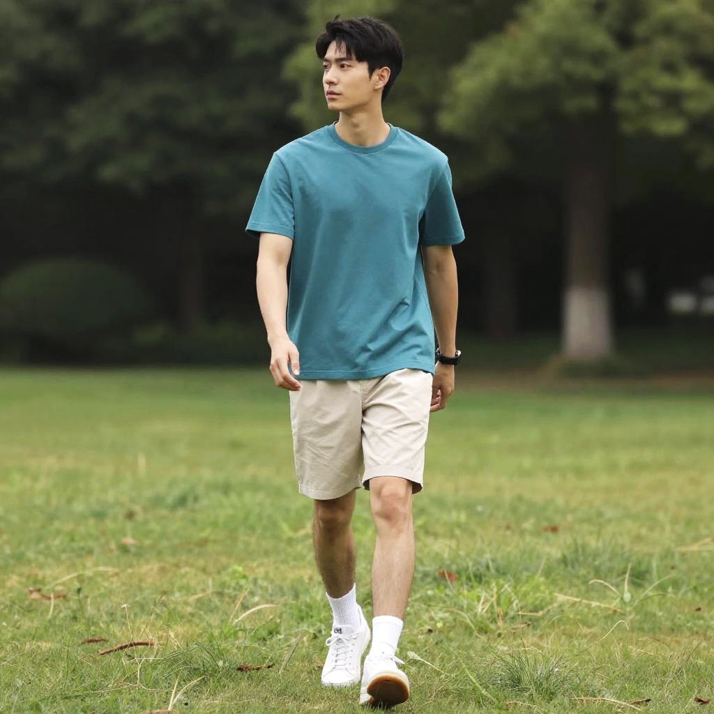 A confident young man walks through a lush green park, embodying a sense of tranquility and style. His casual attire, featuring a teal t-shirt and light shorts, complements the serene outdoor setting, making it a perfect representation of modern lifestyle photography.