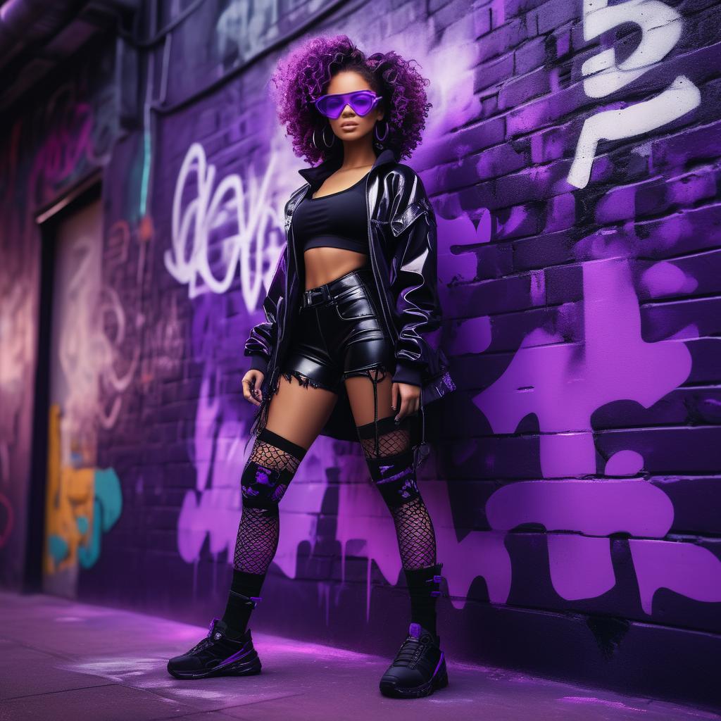 Young woman with curly hair wearing a shiny purple jacket, matching purple sneakers, and oversized purple sunglasses squats in front of a vibrant purple graffiti wall. She also has ripped black pants and fishnet stockings, embodying a stylish and edgy street fashion look.