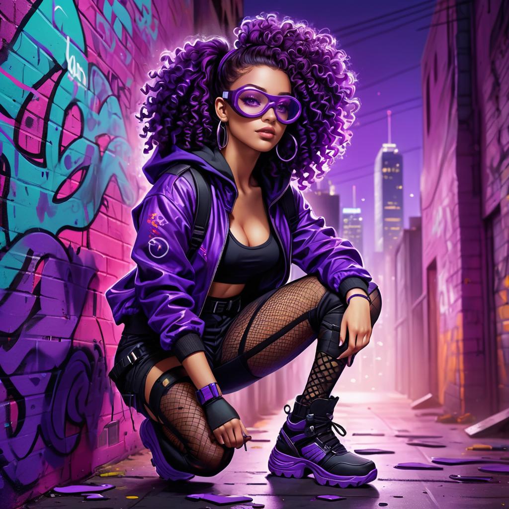 A stylized young woman with voluminous curly hair wearing purple goggles and dark streetwear, spray painting vibrant purple graffiti on a city wall, urban environment with moody lighting, fishnet stockings and layered accessories, detailed digital painting style, neon purple and black colors dominating the scene
