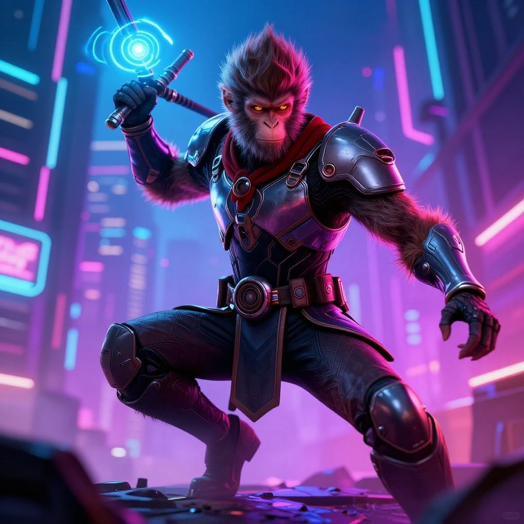 Anthropomorphic monkey warrior in futuristic armor, holding a glowing energy staff, cyberpunk cityscape background, vibrant neon colors, dynamic action pose.