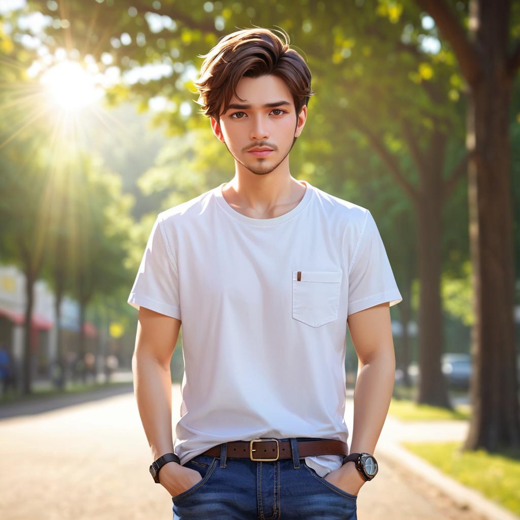 1boy, male focus, solo, shirt, denim, jeans, pants, white shirt, watch, facial hair, brown hair, outdoors, wristwatch, looking at viewer, blurry background, t-shirt, blurry, realistic, sunlight, hands in pockets, tree, brown eyes, closed mouth, day, standing