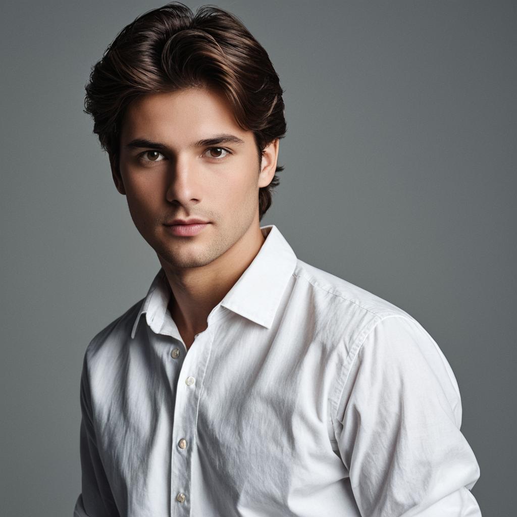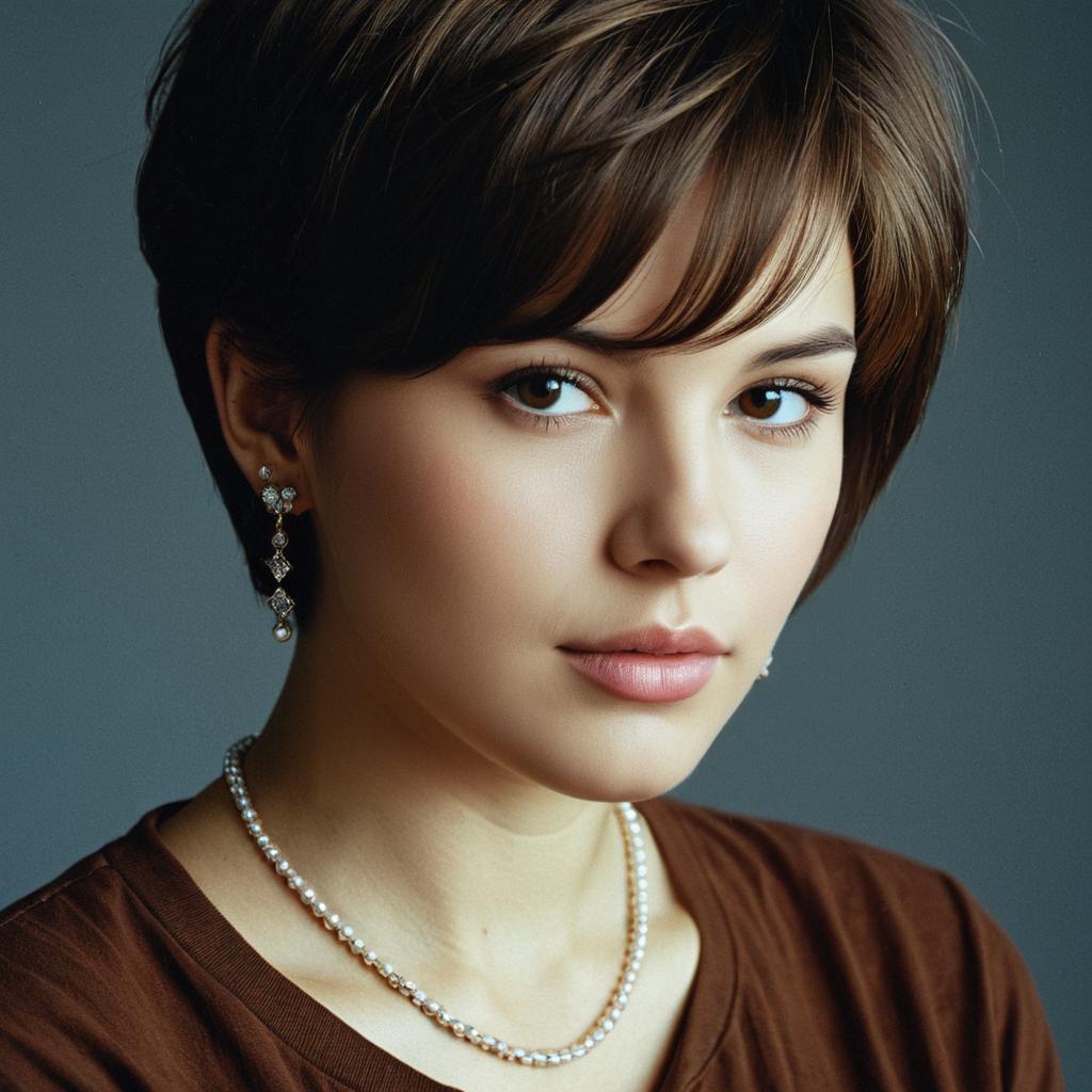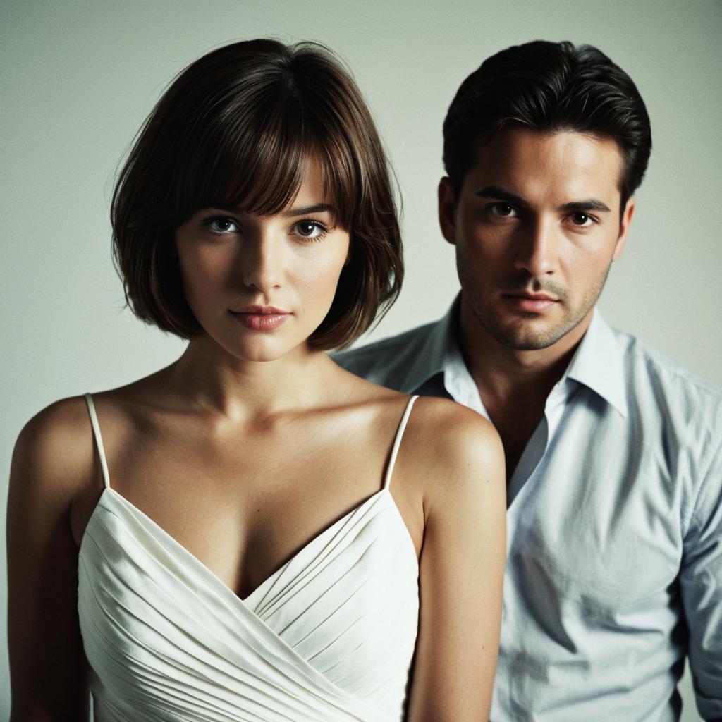 Piece suits man,1girl, solo, dress, realistic, brown hair, white dress, brown eyes, short hair