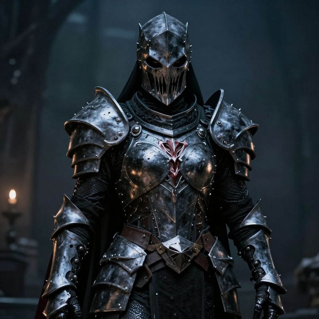 This is a digital CGI image of a dark, imposing knight clad in highly detailed, reflective, metallic armor with a Gothic style. The knight's helmet, featuring a menacing, jagged visor, obscures their face, adding an air of mystery. The armor is adorned with intricate, angular designs and a prominent, red, triangular emblem on the chest. The background is shrouded in darkness, with a dimly lit candle on the left side, providing minimal light. The overall color palette is dark and moody, with highlights of silver and red on the armor. The image conveys a sense of power and foreboding.